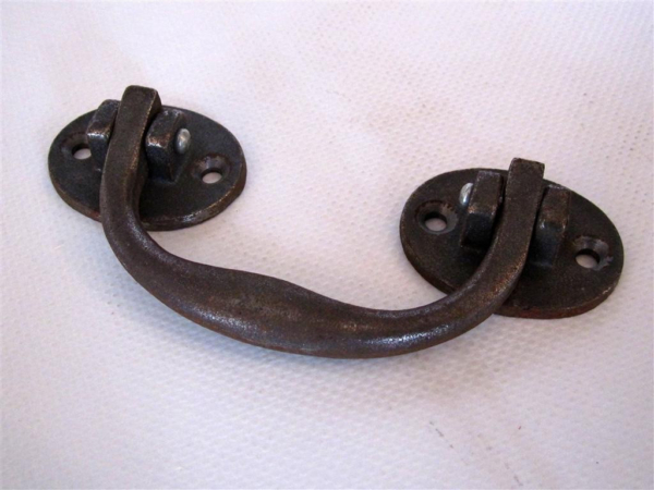Sarggriff aus Gusseisen, groß, 90 x 54 mm ist ein großer Schubladengriff / Truhengriff aus massivem Eisen. Der Griff hat einen Anschlag nach oben, so dass sich der Griff nicht weiter nach oben als horizontal dreht.