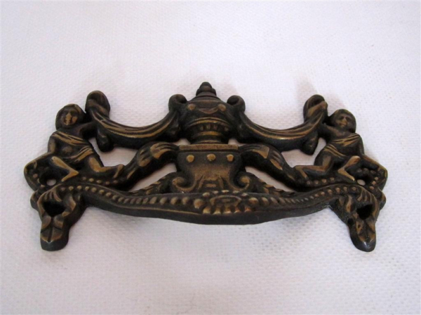 Schubladengriffschrank Messing antik 135x82mm ist ein großer Gussgriff für Ihren Schrank oder Ihre Schublade mit einem antiken Messingfinish. Der Griff ist reich verziert mit Bildern von Putten und einer römischen Vase. Dieser Griff passt gut zu Ihrem antiken oder klassischen Schrank.