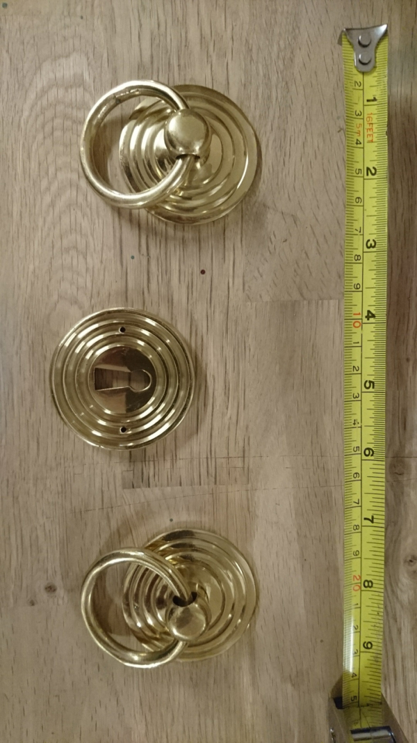 Cabinet Hardware Set Brass Round 2 drawer pulls and 1 key plate 55mm has 3 cover plates with a diameter of approximately 55mm. The rings have a diameter of 47mm. After installation, the key plate protrudes 5mm and the rings protrude 22mm. The height of the keyhole is 20mm.