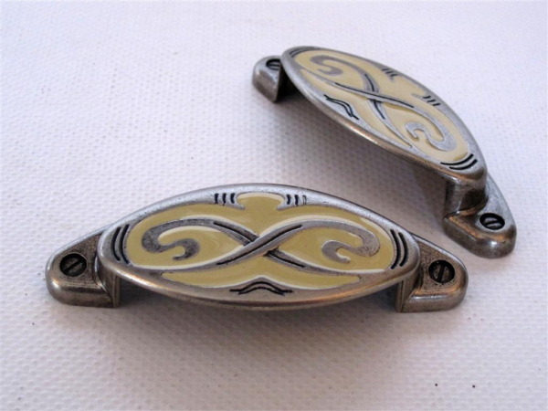 Cup handle antique Silver with Ivory inlay 84mm is a solid shell handle with an antique silver/nickel finish. The bowl handle has an ivory colored inlay. The handle is of heavy quality. The appearance of the cup handle is semi-glossy and smooth. This pull handle is suitable for heavy drawers.