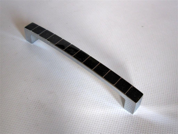 Greep vierkant glanzend chroom ingelegd met zwarte glitter groot 140mm is 140mm breed en 13mm hoog. Na montage steekt deze greep 25mm uit. De boorgaten zitten op 128mm van elkaar.