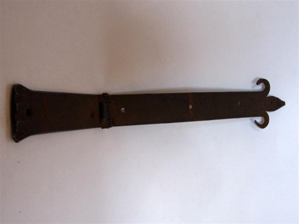 Scharnier Antiek IJzer geroest Franse lelie 270mm is een antiek scharnier gemaakt van ijzer met een roestige afwerking. Het scharnier heeft een Middeleeuwse uitstraling met een Franse lelie aan het uiteinde. Dit scharnier past goed op je antieke kastdeur of kist.