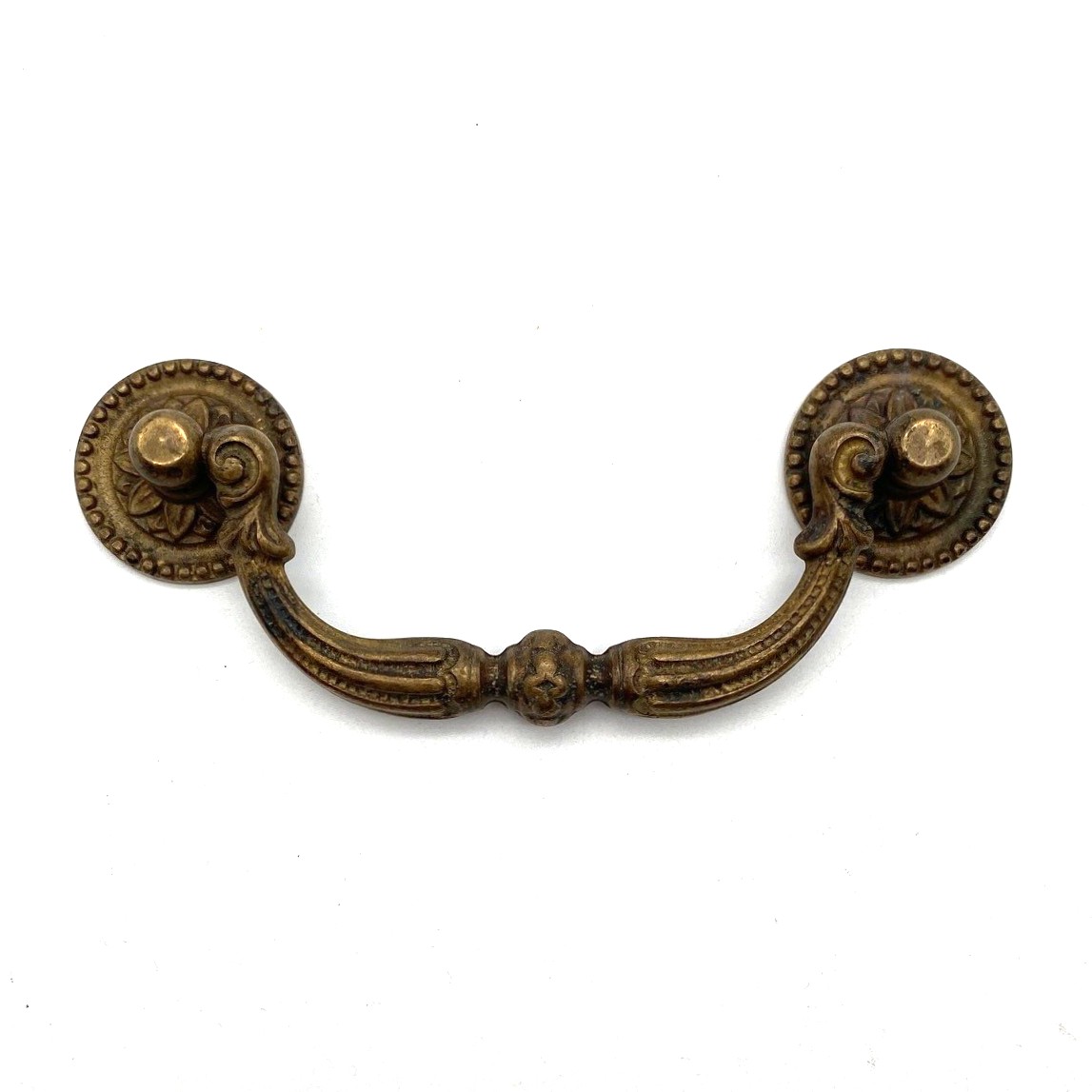 Ladegreep Messing Antiek Bloem en knoop 96mm is een mooi klassieke ladegreep in de Louis XIV stijl voor meubellades. De ladegreep heeft een antiek messing afwerking en is gemaakt van messing.