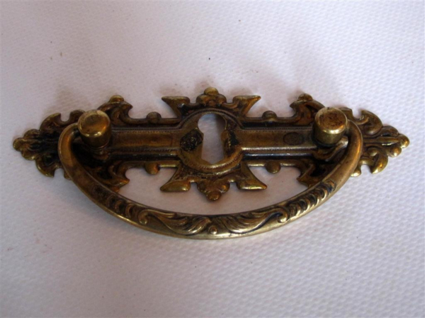 Ladegreep Messing antiek horizontaal met sleutelgat 114mm is een mooie, gestanste en bewerkte ladegreep voor meubellades. De ladegreep heeft een antieke messing afwerking.