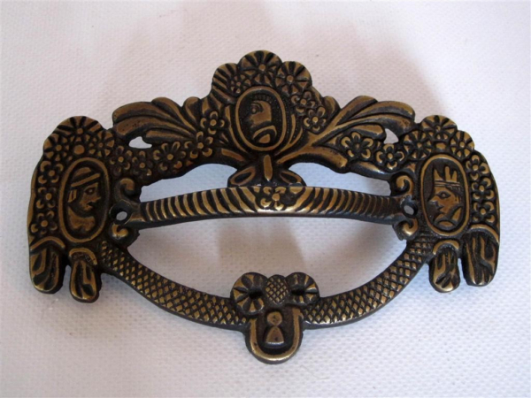 Ladetrekker Kabinet Messing antiek 142x100mm is een grote, gegoten greep voor je kabinet of lade met een antieke messing afwerking. De greep is weelderig versierd met afbeeldingen van een boer, ridder en koning, bloemmotieven en een pion aan de onderkant. Deze greep past goed op je antieke of klassieke kabinet.