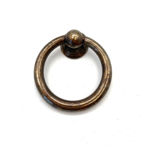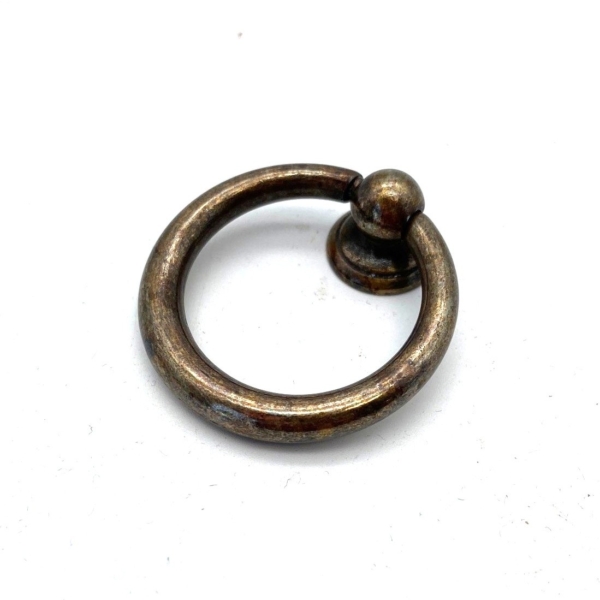 Ringgreep Messing antiek groot 40mm is een grote greep in de vorm van een ring aan een bol knopje met een antieke messing, bronskleurige afwerking. Achter het bolletje zit een afdekplaatje. Deze ringgreep past goed op je antieke meubel of lade.