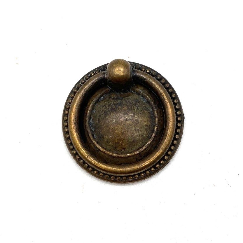 Ringgreep Messing Antiek klein 40mm is een kleine ringgreep in de vorm van een ring met een achterplaat. De greep is gemaakt van zamak* met een antiek messing finish. Deze ringgreep past goed op je antieke of klassieke meubelstuk.