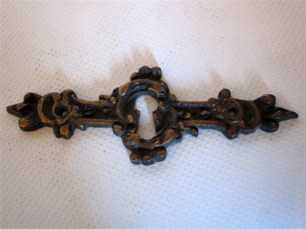 Sleutelplaat Messing antiek horizontaal 112x36mm is een mooie gegoten sleutelplaat gemaakt van ijzer met een antieke afwerking. De sleutelplaat is horizontaal gericht. Deze sleutelplaat past goed op je antieke of klassieke meubel en lades.